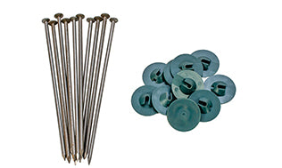 防草シートを設置するための釘とパットのセット。 上部のパットは小ぶりですが釘頭を包んで隠すため、時間が経っても釘のサビが見えず見た目の美しさを保ちます。 釘の長さ20cm。硬めの地面やたくさん使用する場合におすすめ。色は黒と緑から選べます。
